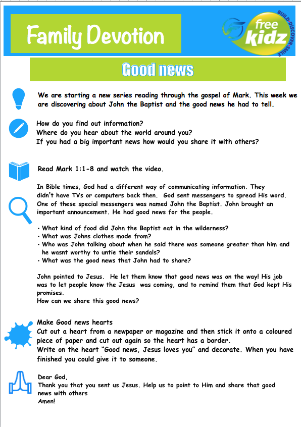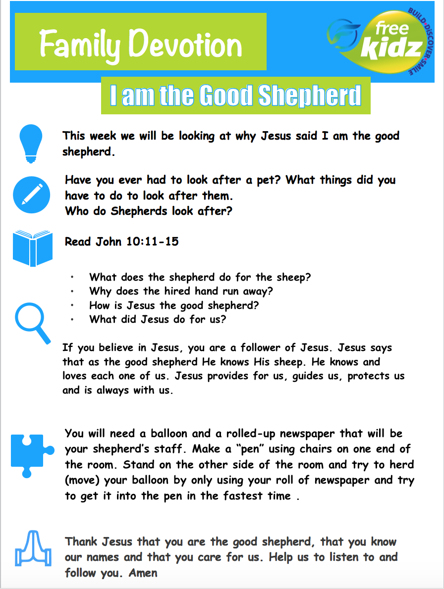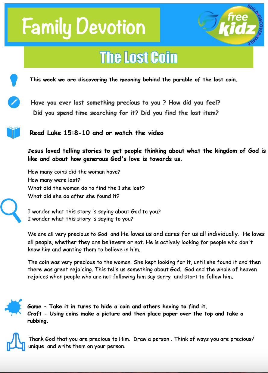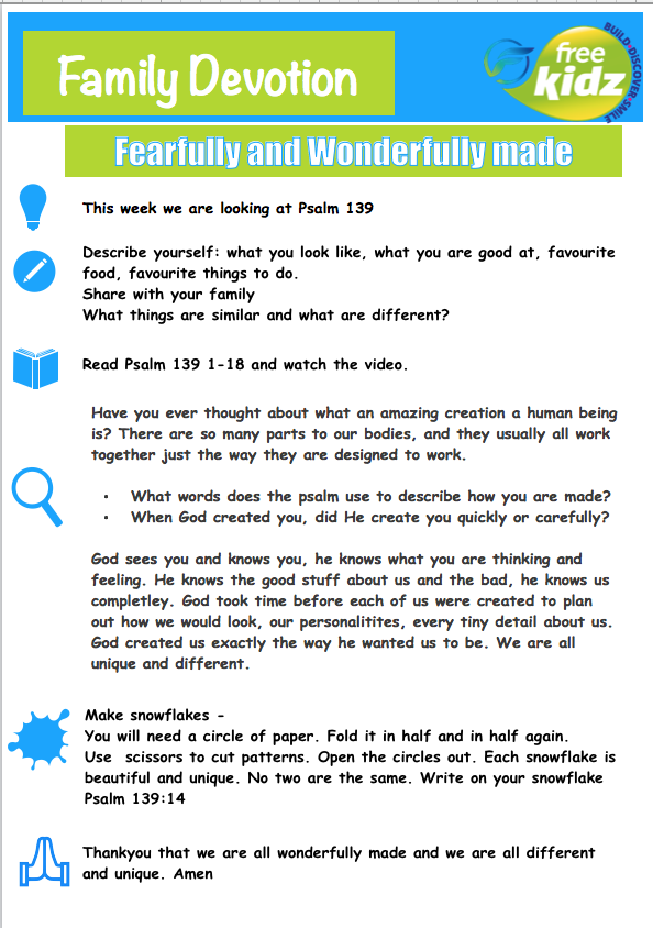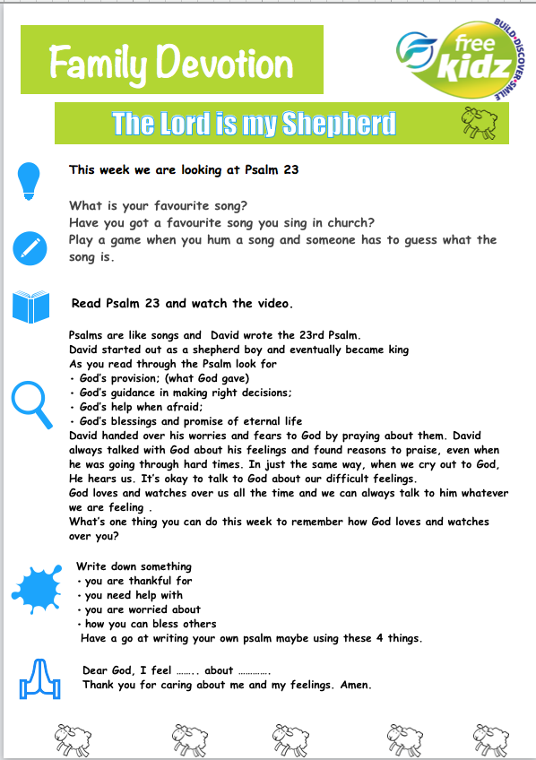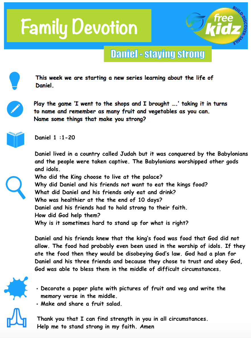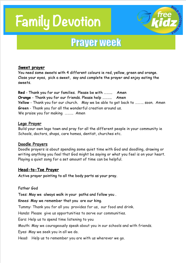 Due to the advice from the government regarding the Coronavirus all Freekidz activities are closed until further notice. However, we would still love to stay connected with you so below are some resources you can use with your family at home to view online or to download.